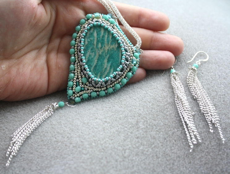 Wisior z kaboszonem uralskiego amazonitu (ma przepiękny nasycony kolor) wykonany techniką haftu koralikowego. Użyto koralików Toho (oczywiście z beading.com.pl) oraz szlifowanych czeskich koralików. Podszyte ekologicznym zamszem. W komplecie lekkie letnie kolczyki.