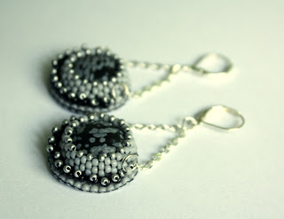 Piękne lekkie kolczyki wykonane techniką haftu koralikowego. Główny bohater - obsydian śnieżny. Koraliki Toho 8 i 11, oraz drobne czeskie koraliki w srebrnym kolorze.