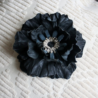Zrobiłam to!!!!!!!!! Jestem z siebie niezmiernie dumna ;) Kwiat z naturalnej skóry, uformowany całkowicie ręcznie beż żadnych narzędzi (które w Polsce w ogóle nie wiem czy są dostępne). Strasznie mi się spodobało to czasochłonne zajęcie :) Wczoraj cały wieczór robiłam płatki, a dzisiaj przed pracą szybko to złożyłam :)